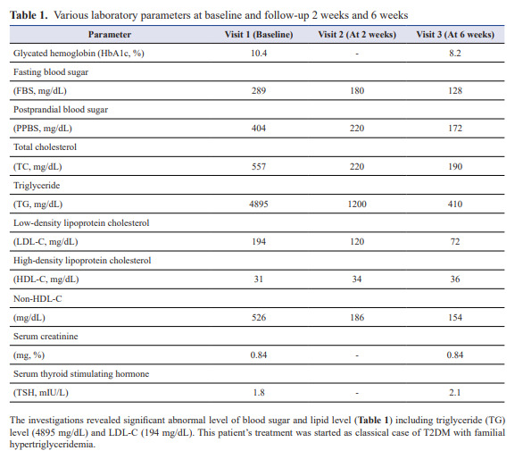 This patient was having uncontrolled HbA1c and LDL-C levels for that required anti-diabetic medications and Atorvastatin 20 mg was started. Severe hypertriglyceridemia (TG >500 mg/dL) is certainly a risk factor for the development of cardiovascular disease (CVD) and acute pancreatitis. There is growing support for unadjusted elevated triglyceride levels as an independent CVD risk factor, however, the extent to which elevated triglycerides constitute a direct risk for CVD and whether treating elevated triglyceride level especially in patients with diabetes have reduced the CV events have been heavily debated. Various international societies have recommended that severe and very severe hypertriglyceridemia increase the risk for pancreatitis and need to be treated at the same time mild or moderate hypertriglyceridemia may be a risk factor for cardiovascular disease.7,8