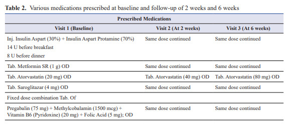 This patient was ideal case study of familial hypertriglyceridemia with T2DM. Accordingly, patient was briefed about lifestyle modification including, hypocaloric diet (up to 1600 kcal/day) with simple carbohydrates and low in fat. To control elevated HbA1c and sugar level; insulin and metformin therapy were started as mentioned in Table 2. Apart from medications for control of diabetes mellitus, the patient was advised a moderate dose of atorvastatin (20 mg) and saroglitazar (4 mg). In this case, TG level was more than 4800 mg/dL and as per international guideline recommendation, to avoid acute pancreatitis; TG-lowering agent – saroglitazar was added along with statin