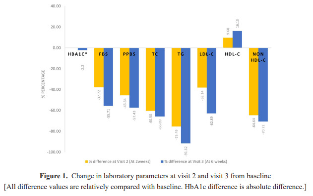 The first follow-up was scheduled after 2 weeks with lipid and sugar profile to evaluate medication response and a significant reduction in lipid and glucose parameters were observed (Table 1 and Figure 1). In second, visit dose of atorvastatin was increased to 40 mg and saroglitazar 4 mg continued along with other anti-diabetic drugs. The second follow up was scheduled after 6 weeks again with glucose and lipid profile. In laboratory parameters, improvement was observed, and the atorvastatin dose was increased up to 80 mg and continued with saroglitazar 4 mg and other anti-diabetic drugs.