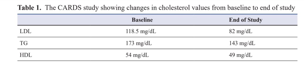 Patient with uncontrolled diabetes is at risk of micro and macrovascular complications, particularly CVD. Diabetic patients without previous history of myocardial infarction (MI) have a high risk of MI as nondiabetic patients with previous MI,11 therefore all diabetic patients should be treated aggressively for the prevention of CVD events. Elevated LDL cholesterol levels should be addressed initially with tight glycemic control which can be achieved with diet, exercise, and antidiabetic agents may substantially improve the lipid profile and reduce the risk of CVD in some patients as per the current American Diabetes Association (ADA) and National Cholesterol Education Program (NCEP) guidelines.12,13However, few patients might need intensive lipid-lowering therapy to reduce their cardiovascular risk, most commonly with one of the statins or fibric acid derivatives.14The Collaborative Atorvastatin Diabetes Study (CARDS) has shown significant improvement before and after statin treatment.15