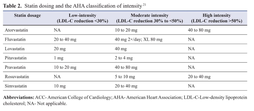 22. Chou R, Dana T, Blazina I, Daeges M, Bougatsos C, Grusing S, et al. Statin Use for the Prevention of Cardiovascular Disease in Adults: A Systematic Review for the U.S. Preventive Services Task Force [Internet]. Rockville (MD): Agency for Healthcare Research and Quality (US); 2016 Nov. (Evidence Syntheses, No. 139.) Table 1, Statin Dosing and ACC/AHA Classification of Intensity. Online available at: https://www.ncbi.nlm.nih.gov/books/NBK396417/table/ch1.t1/