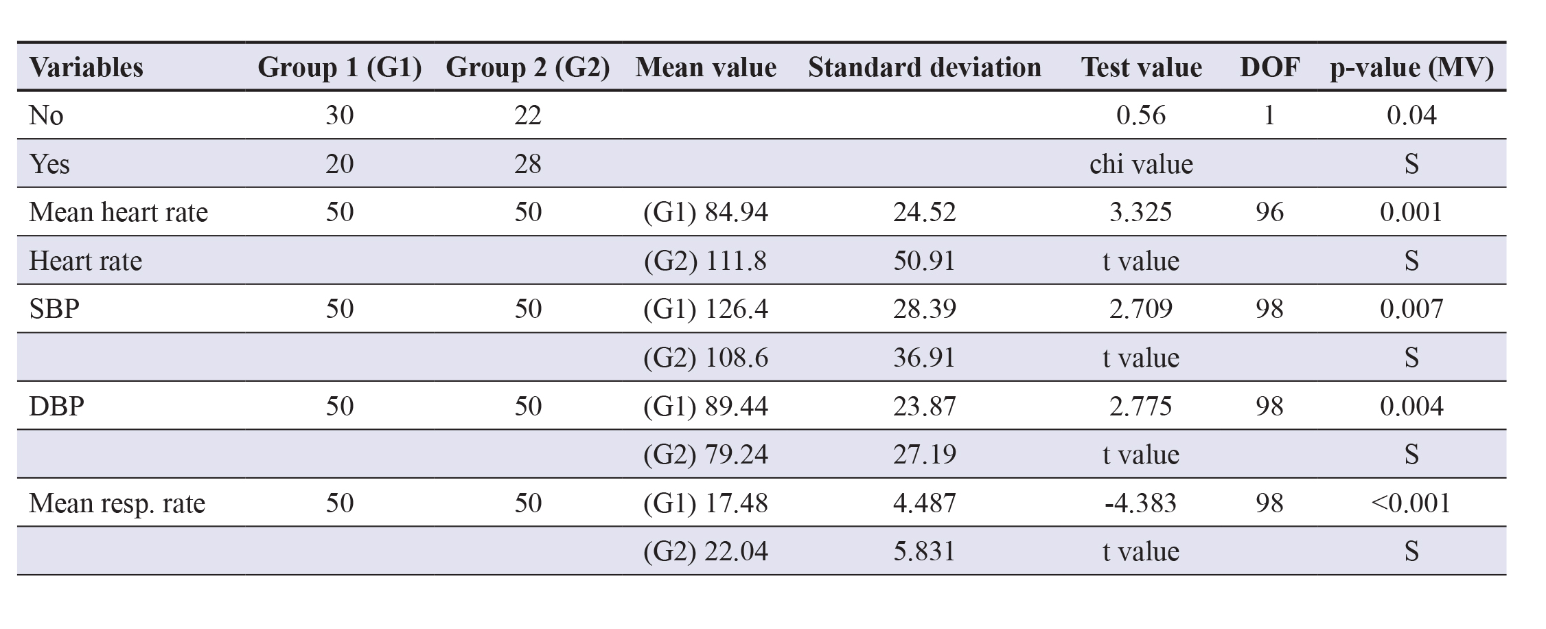 The mean heart rate was comparatively higher in group 2 (111.8/min) contrasting group 1 (84.94/min) which wasstatistically significant (p=0.001). The mean SBP was higher in group 1 (126.4 mmHg) vs. group 2 (108.6 mmHg). Further,the mean DBP was more in group 1 (89.44 mmHg) contrasting group 2 (75.24 mmHg) and both were found to be statisticallysignificant (p<0.05).