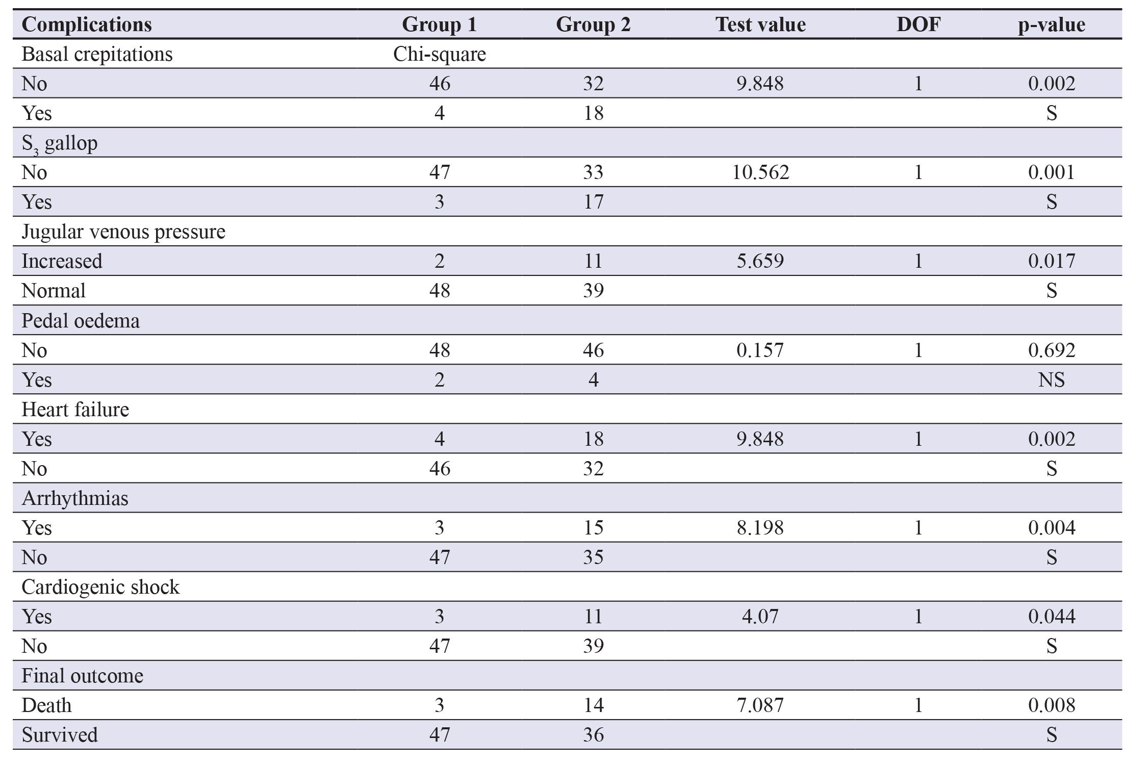 Table 2. Comparison and analysis of the complications of AMI. Abbreviations: DOF- Degrees of freedom;NS- Non-significant; S Significant.