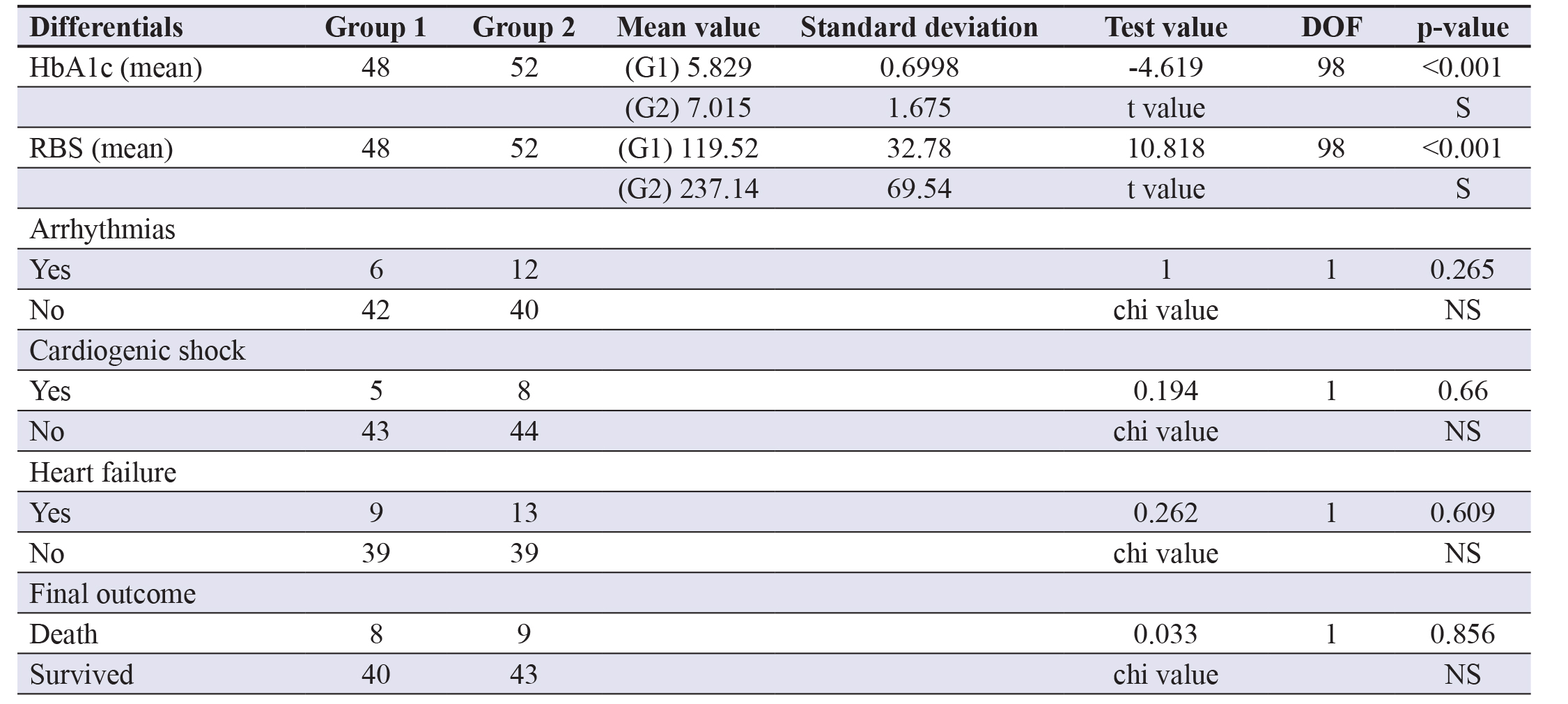 Clinical findings like basal crepitations, S3 gallop, jugular venous pressure (JVP) and pedal oedema were also compared,which suggested a significant difference highlighting the higher incidence of heart failure in group 2. It was recorded thatarrhythmias and cardiogenic shock occurred more frequently with higher blood sugar as in group 2. Mortality was only 6%in group 1, whereas was 28% in group 2 patients with a p-value of 0.008, indicating highly significant difference attributedto hyperglycaemia.